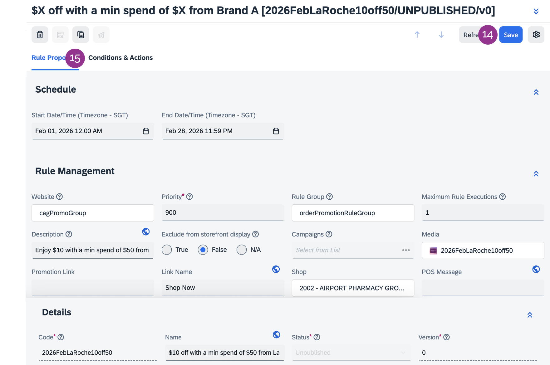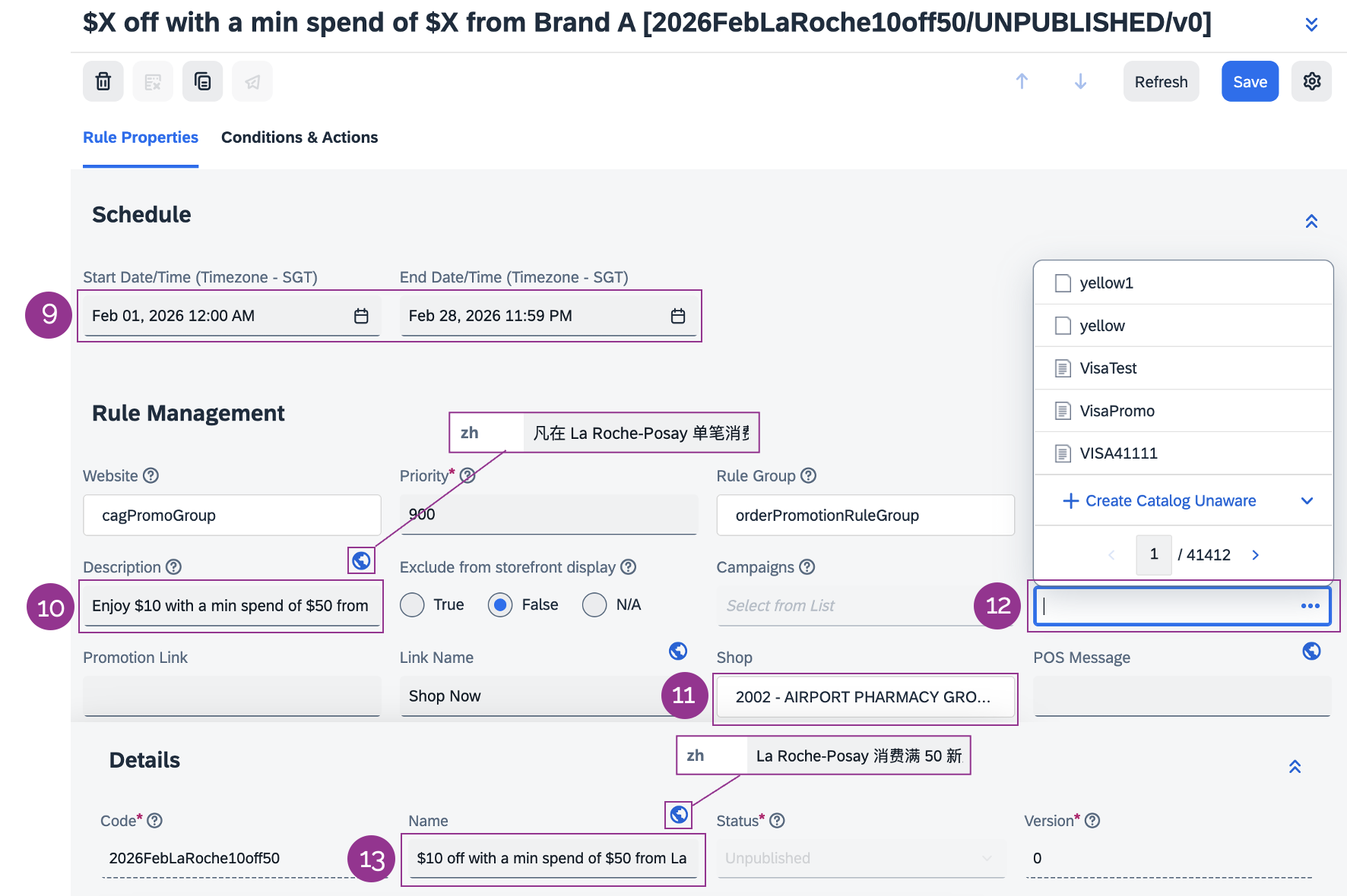 – Promotion Description (ZH) e.g., 于A店购买A品牌商品,消费满$X,可享$X优惠。活动截止至2026年2月28日。