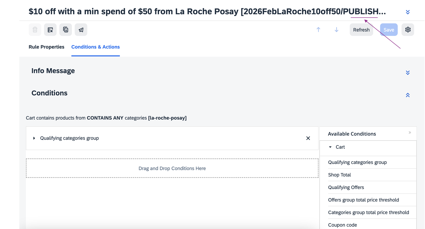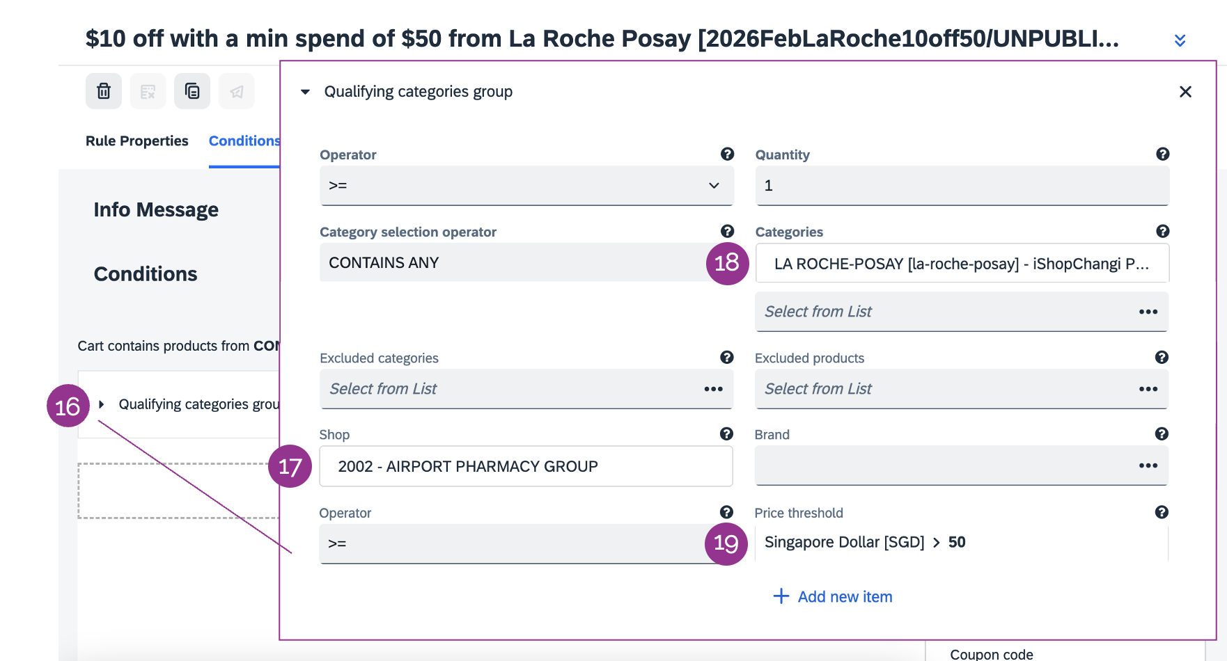 If the promotion applies to only one platform (WeChat Mini Program or iShopChangi website), please add the Qualifying By Channel condition (from the Available Conditions section on the right). Under Qualifying By Channel, click Channel Type ➡️ select the applicable channel.