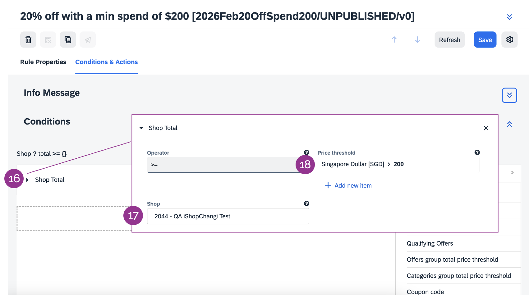 If the promotion applies to only one platform (WeChat Mini Program or iShopChangi website), please add the Qualifying By Channel condition (from the Available Conditions section on the right). Under Qualifying By Channel, click Channel Type ➡️ select the applicable channel.