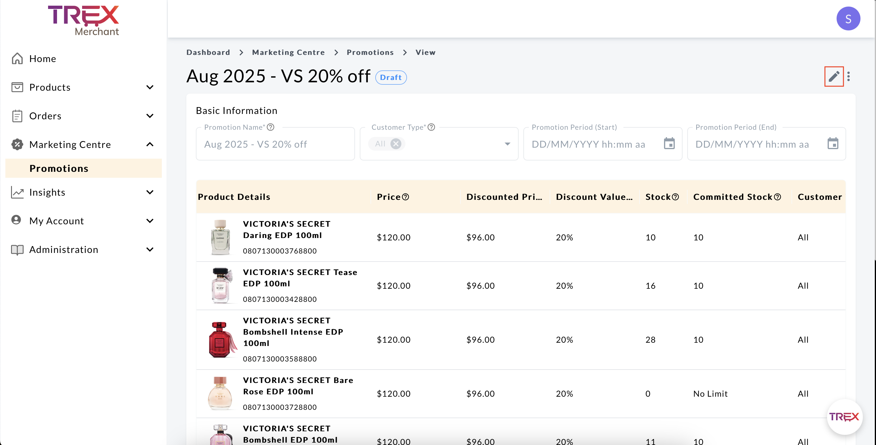 You will need to edit the affected products in the original file that was uploaded. Once you have made the amendments, repeat step 10 and ensure that there is no error with the next upload. - To publish the promotion, click on the pencil icon to edit.