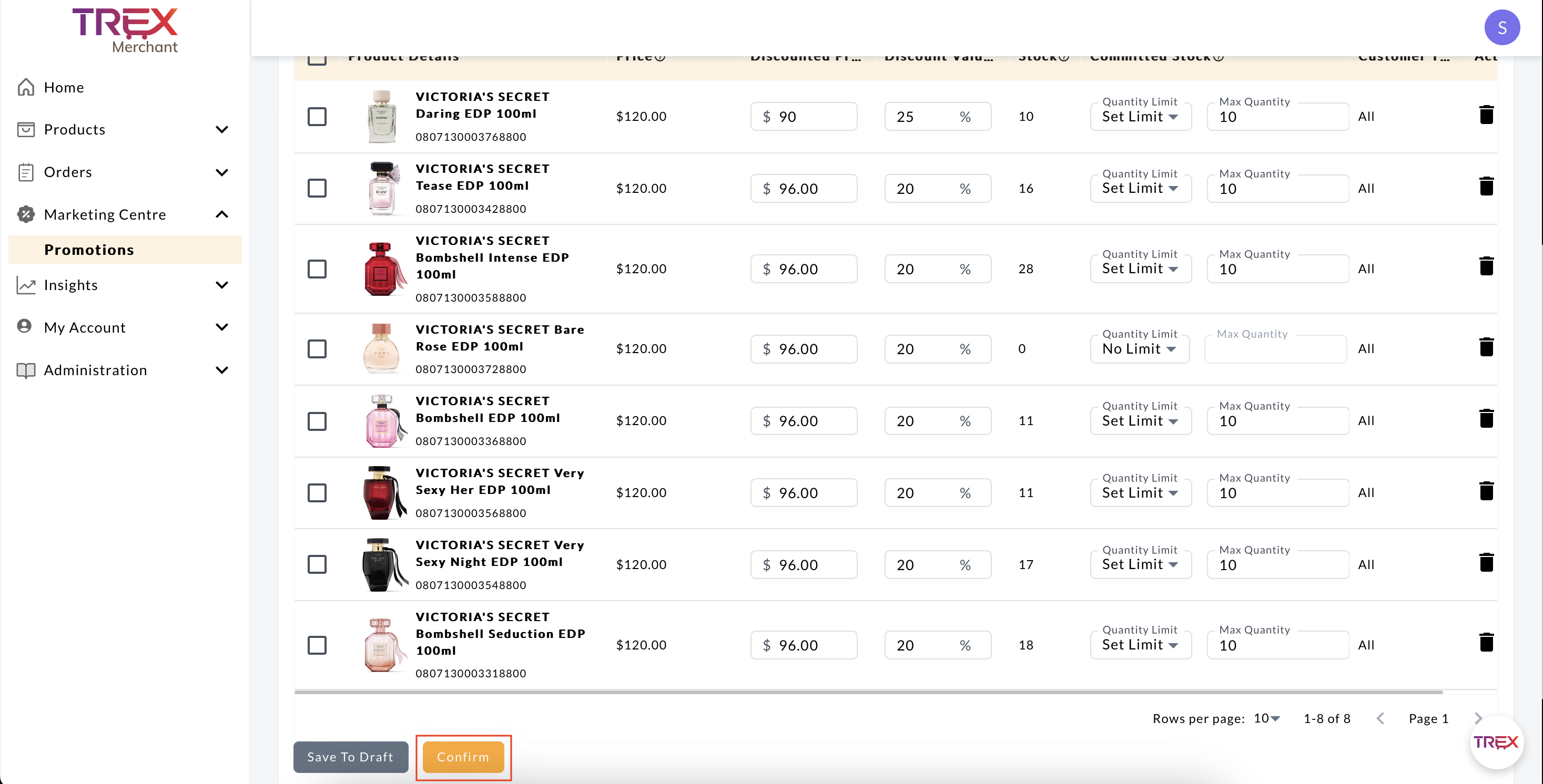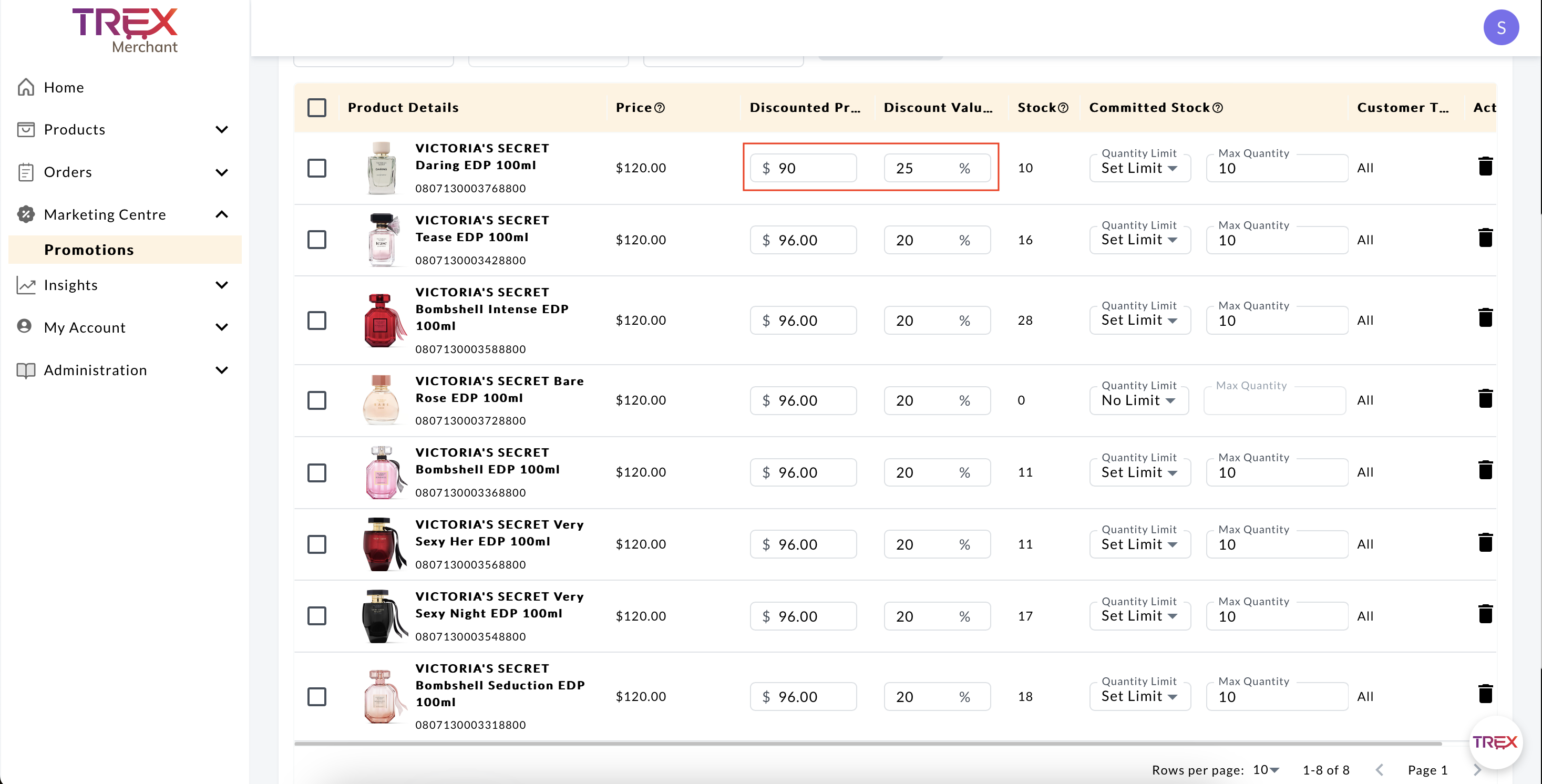 Scroll down to view the products and check if the Discount Value has been set correctly. Example: If you had set the Discounted Price directly, check the Discounted Price column to check if the values are correct. If utilised, check the Quantity Limit and the Max Quantity set.