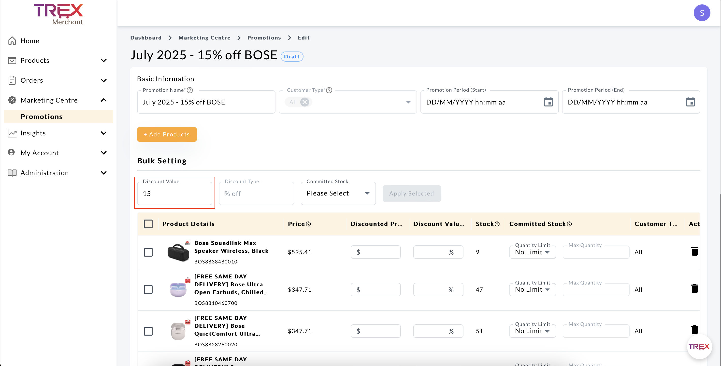 - (For Bulk Setting) Discount Value: Discount value of the promotion. Input numerical values only.