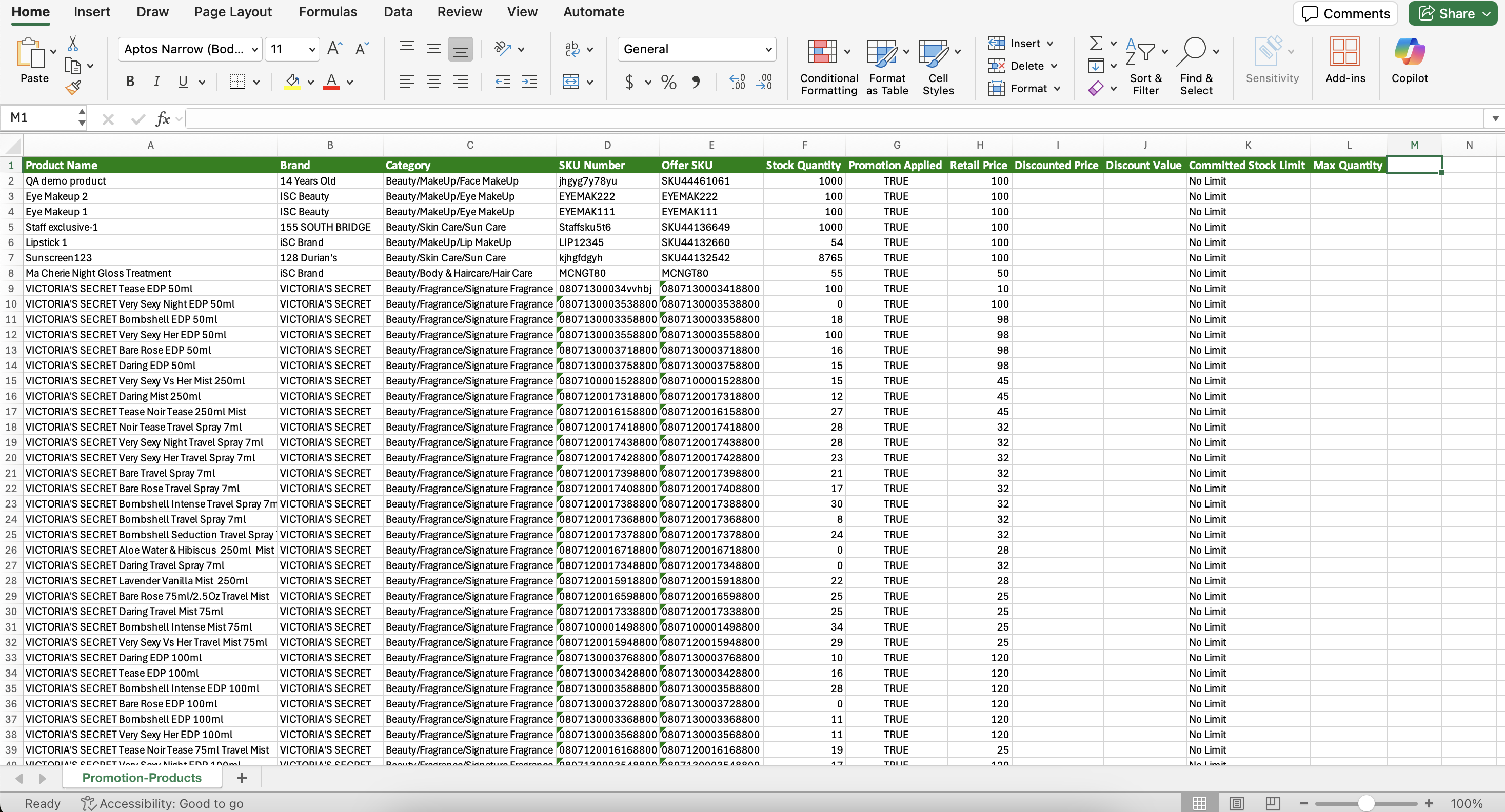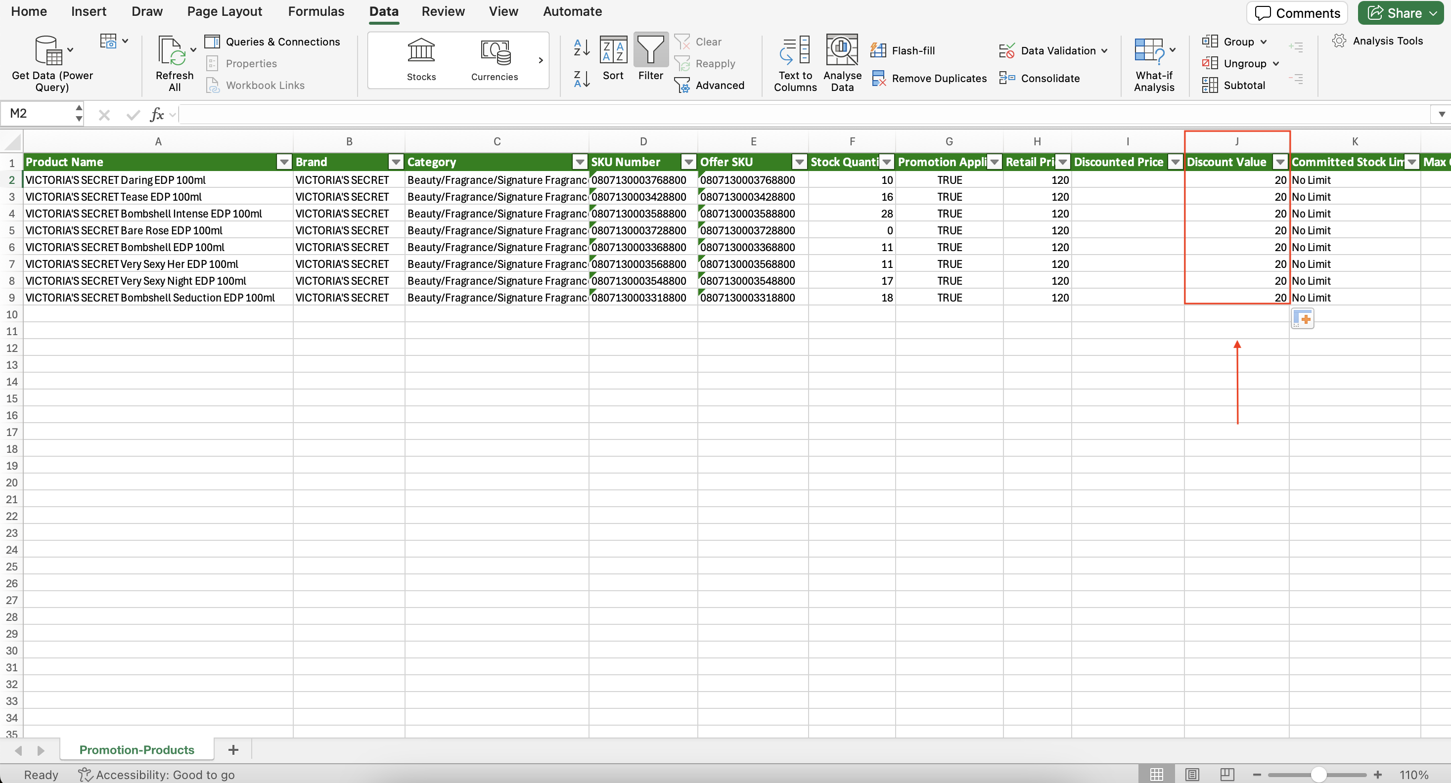 - This is an example of the template. You will be able to see the Product Name, Brand, Category, SKU Number, Offer SKU Code, Stock Quantity, Retail Price, Promotion Applied, Discounted Price, Discount Value fields. ⚠️ Only the Discounted Price and Discount Value fields are editable.
