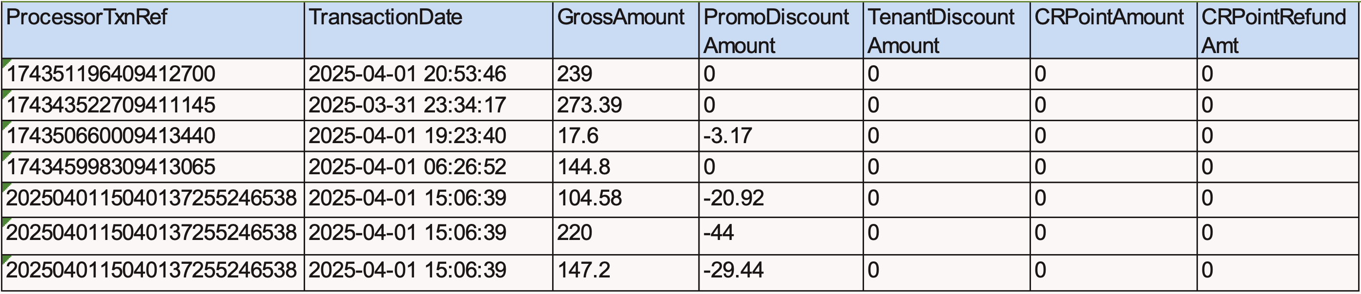 2. In the report, refer to ProcessorTxnRef (Column F) and match it with the Transaction Reference No.. (This number will also be found in the LiquidPay or 2c2p Portal.)