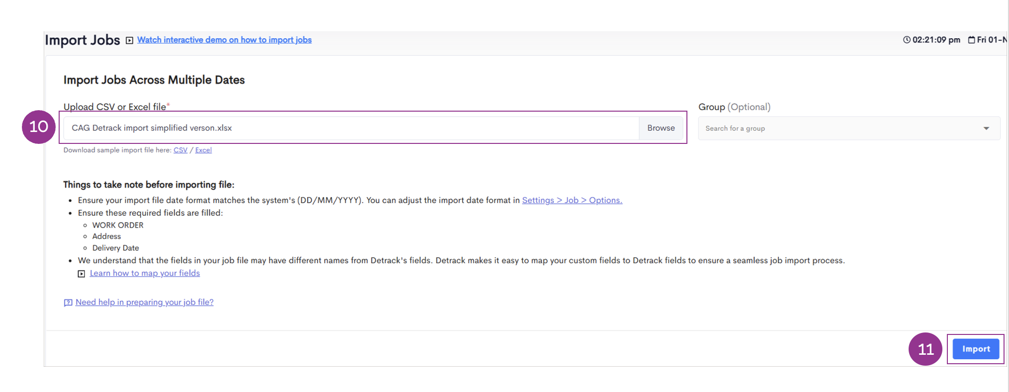 10. Under Upload CSV or Excel file, click on the Browse button to upload the Detrack Upload Template file
