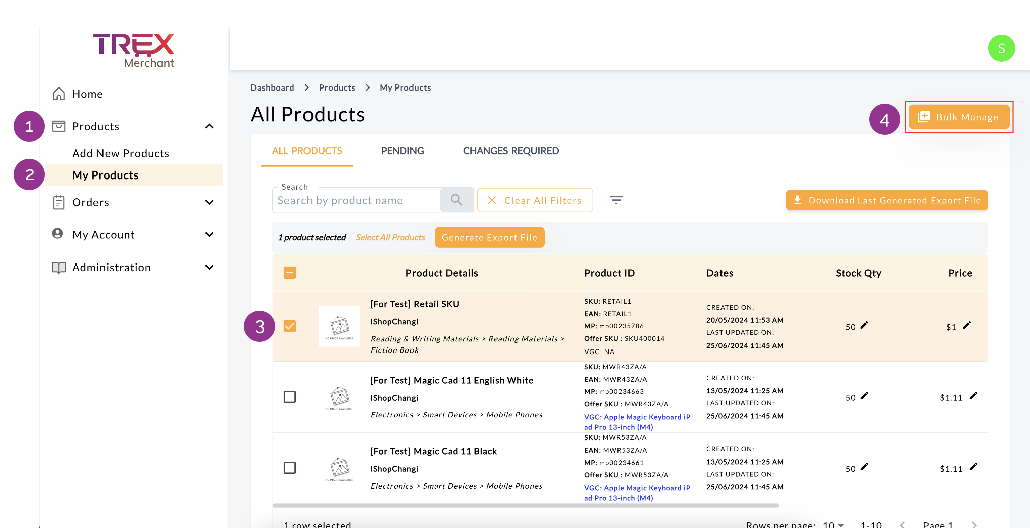 💡 This tutorial shows you how to use the Bulk Manage feature in TREX to bulk edit or update multiple existing product listings at once.