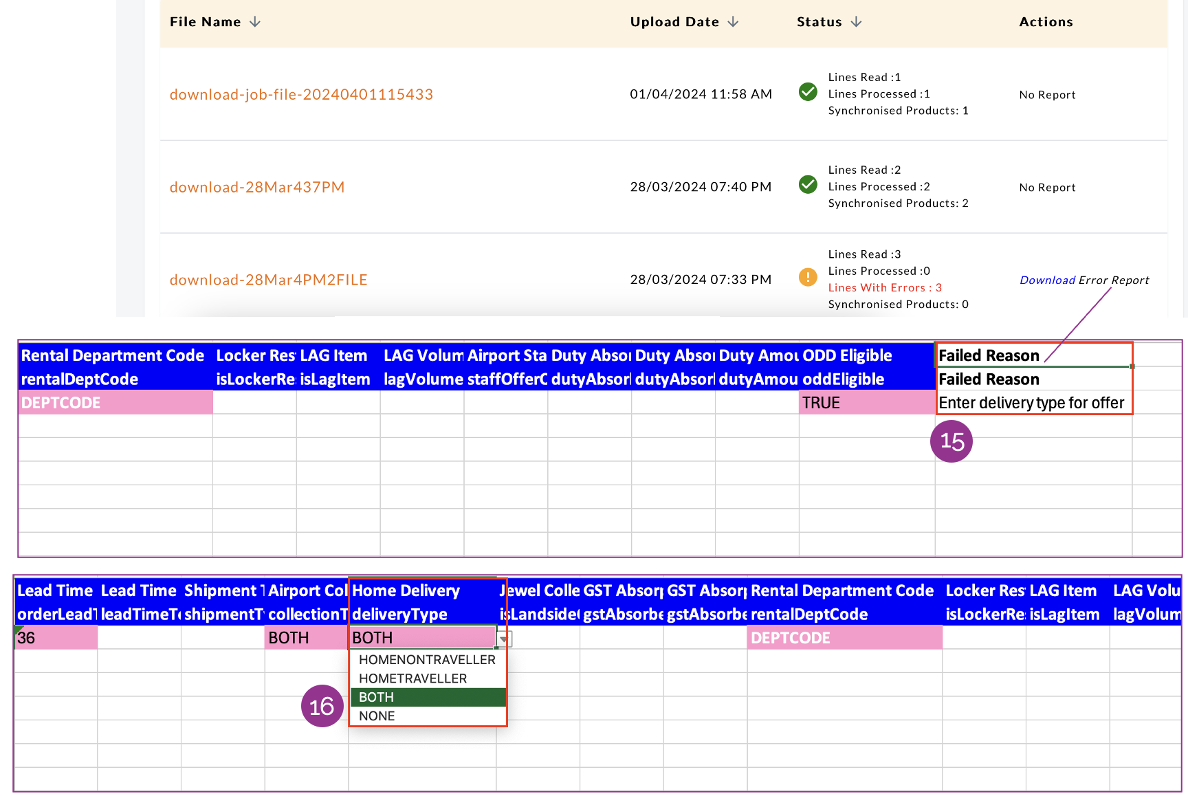 16. In the uploaded file, fix the error for the affect field/column. In this example, the delivery type will need a selection.