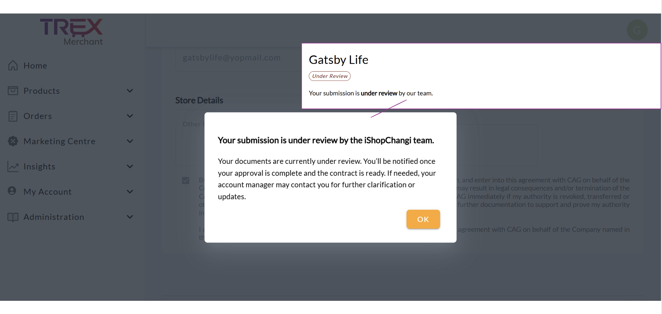 The submission will be reviewed by the iShopChangi team and the onboarding status will change to Under Review. The Authorised Representative will receive a Docusign email to review and sign the contract electronically. Once the contract has been reviewed and signed, the store status will change to Draft, and you will gain access to additional TREX modules (e.g., Products, Orders, Insights, Administration).