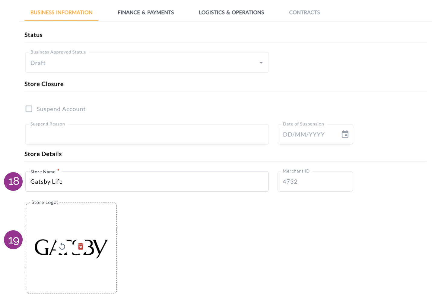 Complete the store set-up by filling in all mandatory fields under the Logistics & Operations section.