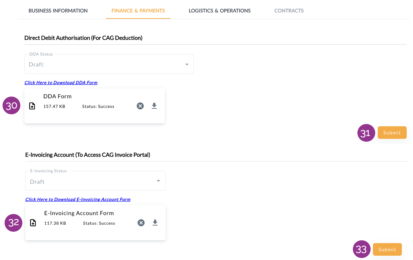 38. Click Submit. The Finance & Payments section will be reviewed once all documents are submitted and processed.